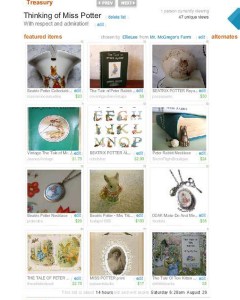 As my own tribute to Miss Potter, I put together a Treasury on Etsy of some of the many wonderful Beatrix Potter items that can be found there. Until sometime tomorrow, you can view the treasury on Etsy. Clicking on the pictures in the treasury will take you to the description page for each item. After the treasury is gone, you can click on the shop names below and be linked to the items included in the treasury. I hope you’ll visit these Etsy shops and browse through all the great items they have to offer.