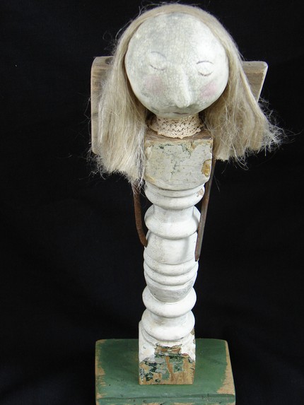 Debra creates her brilliant folk art dolls using simple, everyday items. An old porch spindle with chippy paint becomes the body of Leeza, a delightful art doll with a paperclay head seemingly bowed in meditative prayer.
