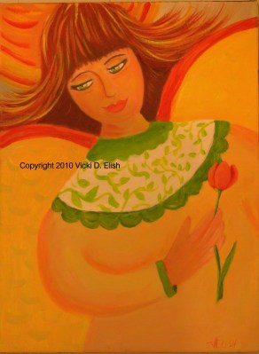 Emily’s Garden Angel was painted for the Emily Young Benefit. It is being included in a garden basket donated for a raffle by my life group at church. A friend of mine made a beautiful and bright quilt to donate and named it Emily’s Garden. I thought Emily’s Garden should have an angel. So here she is. It is my first “folk art” painting. Well, at least I consider it folk art. I have been painting a series of angels in ACEO size and am now doing them in 9×12. Prints and cards of Emily’s Garden Angel will be available in my new shop, Graceful Moments, opening soon at Etsy.com.