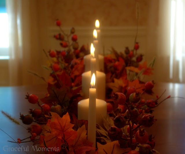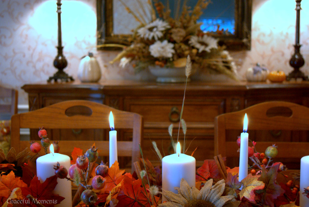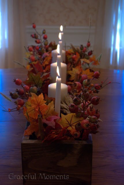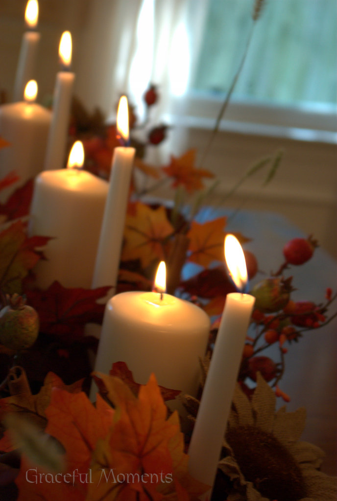 I used two, 2″ layers of floral foam in the bottom to get the candles up where they needed to be. For the arrangement I used three, 6″ pillar candles, four, 9″ tapers, silk leaves, some burlap sunflowers, faux rose hips, real cinnamon sticks and some wild grass that I found along the roadside in September and that stayed on the backseat of my car for three weeks. I am forgetful like that.