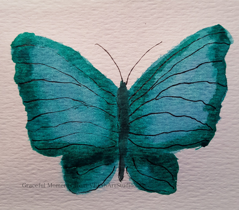 My third effort is probably my favorite. The color values are better and I used a wet-on-wet technique which I believe worked better with this subject. Butterflies are graceful and this technique seems to lend itself to graceful movement better than the other two. I also mixed the paint for the body instead of using a tube color (first effort) or ink (second effort) and I like the color and the way it flows nicely with the wing color. In retrospect, my thought is that this first step should have been the final step. Hindsight is helpful only for future planning.