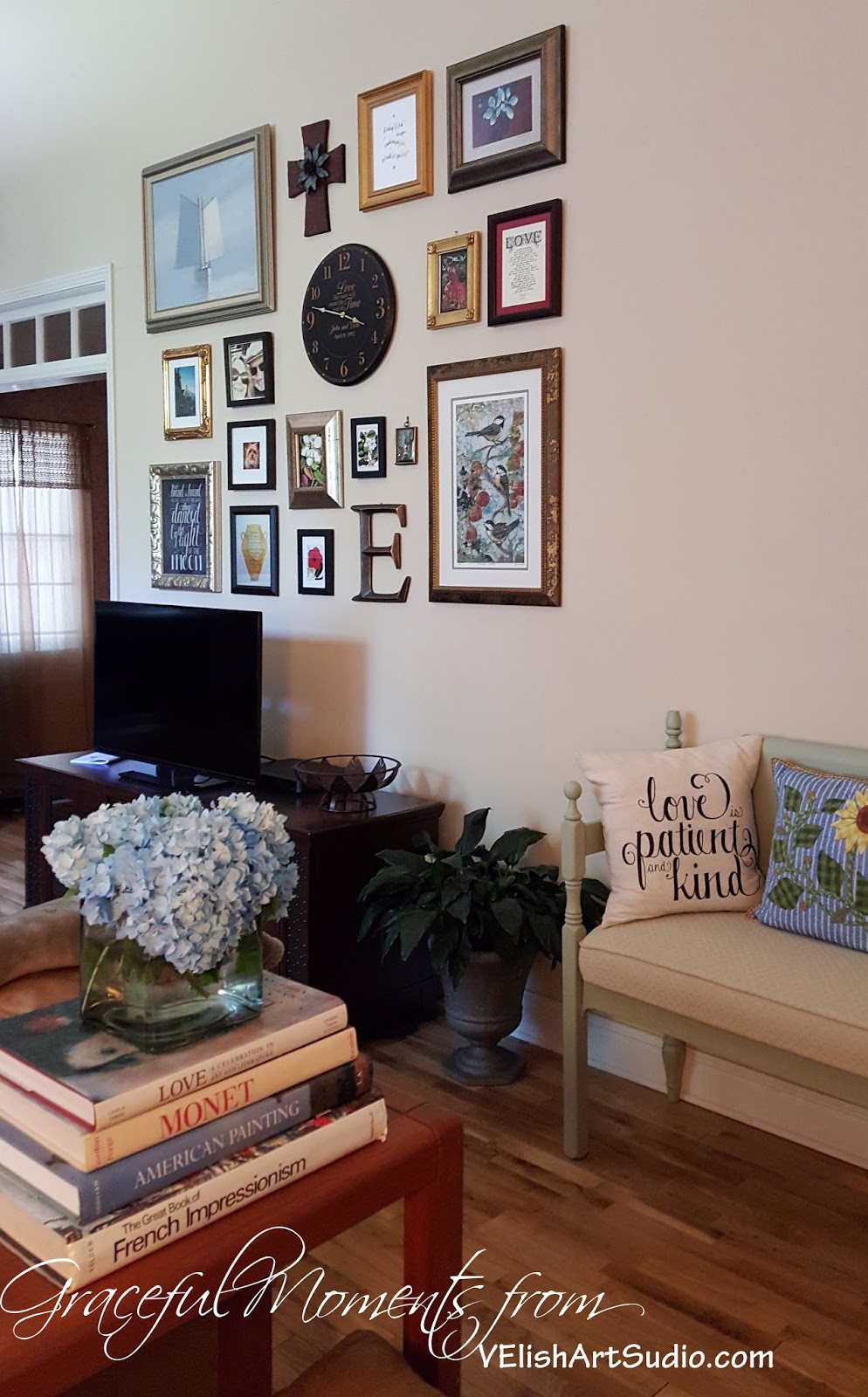 We have had a few gallery walls in various homes over the years, We didn’t call them gallery walls. We called them “arrangements” but a rose by any other name is…well, you know. I had been planning one for our current great room for awhile A few weeks ago, I started pulling all of my collected pieces out of the guest/linen/junk/soon-to-be-a-guest-room-again room and searched the rest of the house for other pieces, while I rearranged furniture, and finished painting a vintage bench.