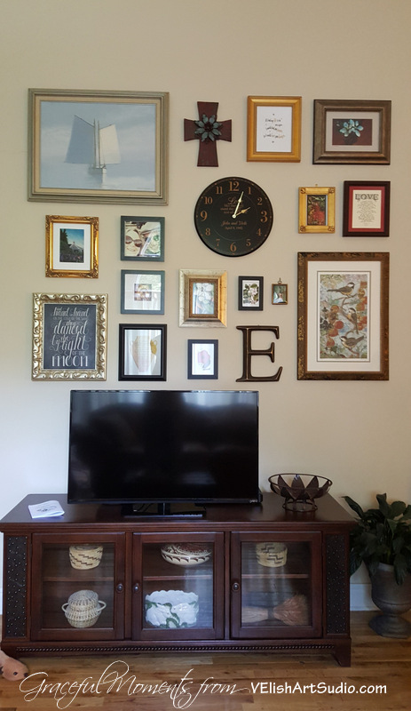 I had no preconceived notion about how large the gallery wall it would be. I began laying out pieces on the great room floor in earnest. My husband observed and made helpful suggestions as I continued to bring in pieces and rearrange them, go back for more, go to the basement to dig out a frame, go to the office/studio to frame a piece, rearrange more, and on and on. I finally had all of the artwork and photographs assembled in the GR and began to place them. Finally, I located the piece for the far right, top, corner and everything seemed to fall into place. It finally had the right mix of frames, colors, and sizes to balance everything out and within a couple of minutes, we had the final design seen above.