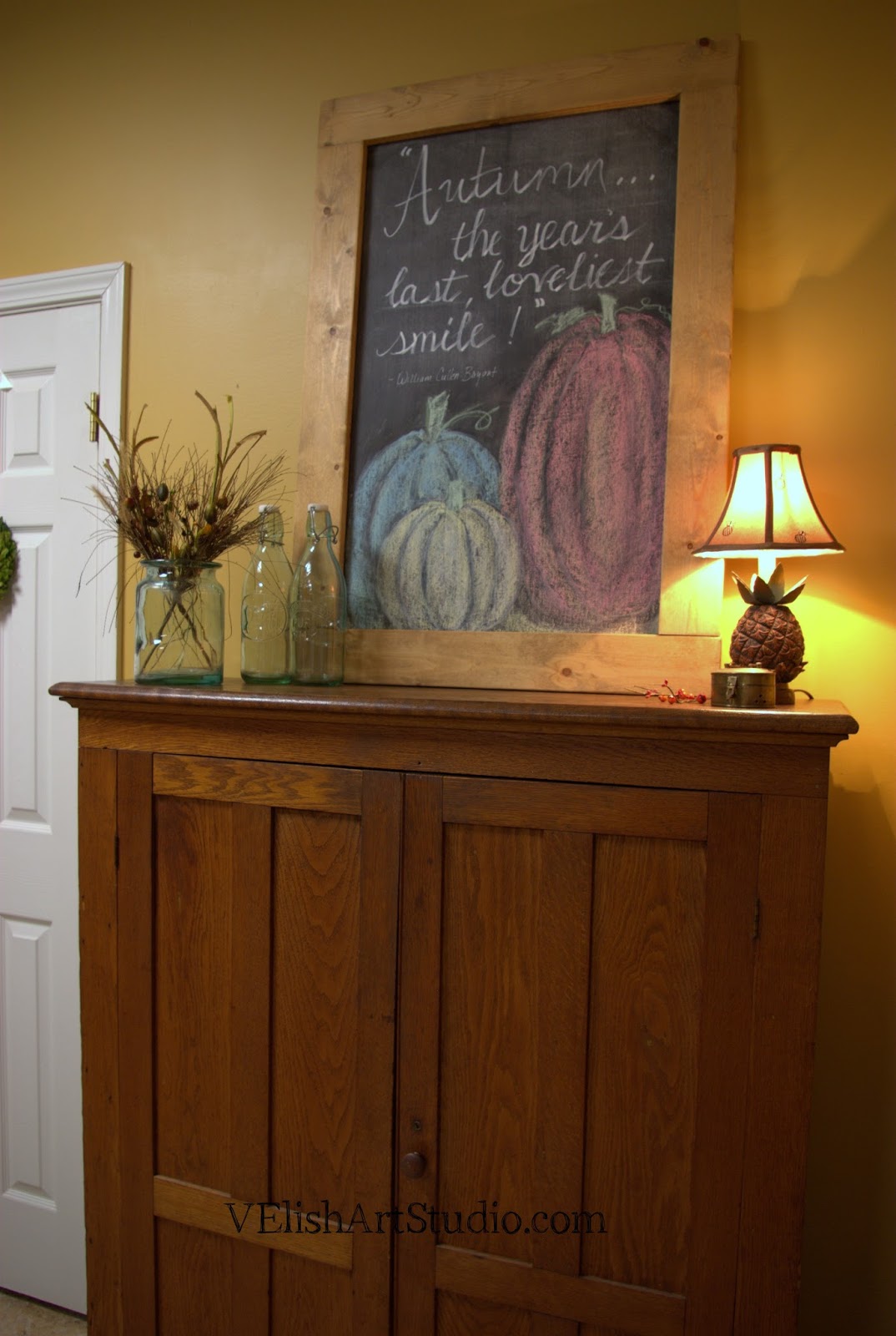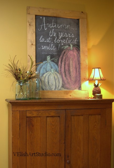 It is finally cooler here in Georgia, so I have been trying to get the house more into the season. I decided to fill the seasonal 24×36 chalkboard frame with a few pumpkins and a favorite quote.