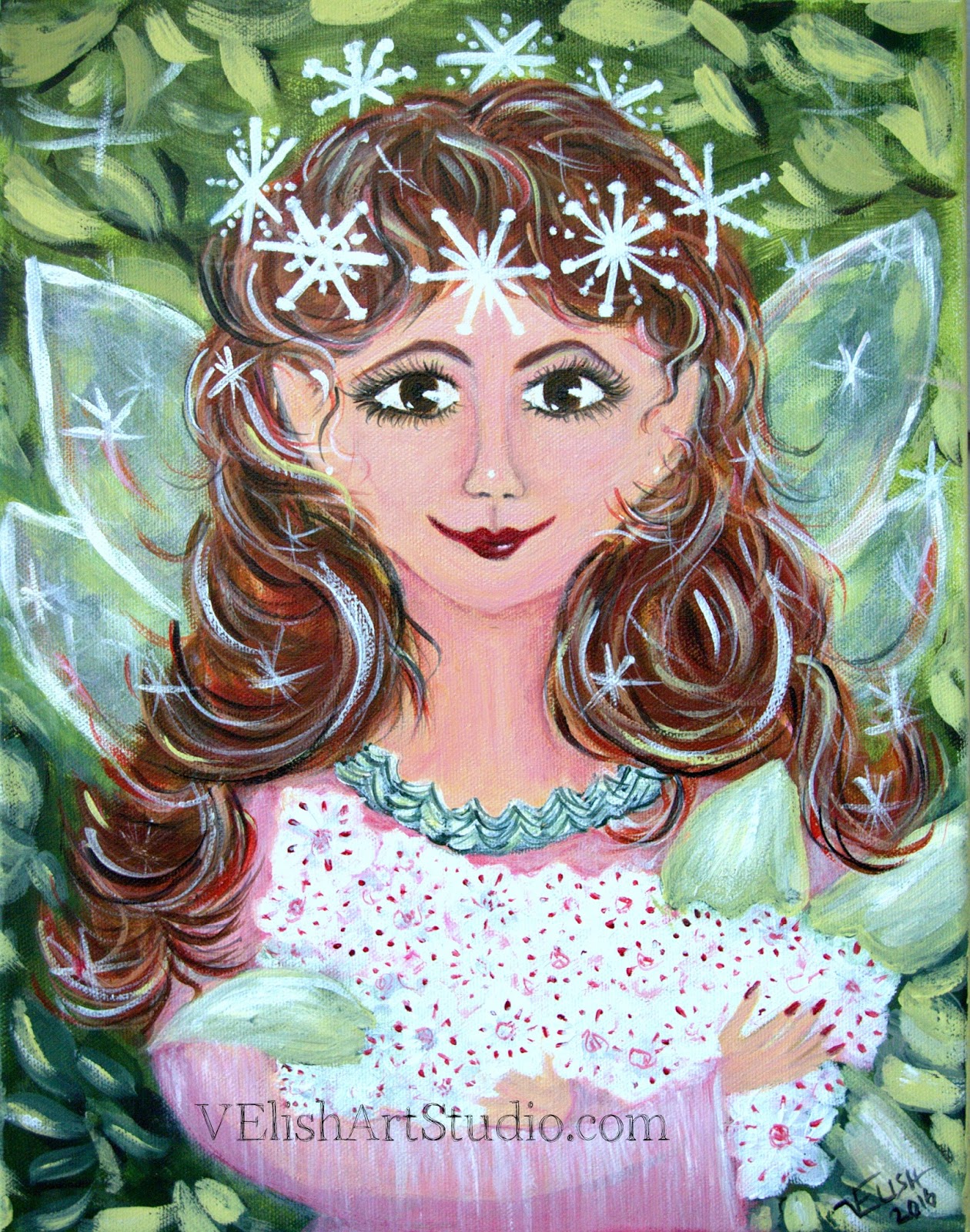 On a different note and from a different day, is a painting of a wee fairy. Moutain Laurel Spring Snow Fairy was a commissioned work for a very special person and her little daughter, “Tater.” I hear that when “Tater” saw it, she said, “Mommy, she looks like us all mixed together.” That is what I was going for so I’m glad it worked out.