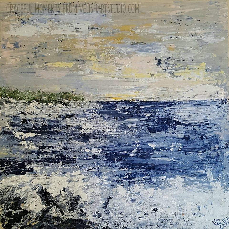 Quite a few months ago, a friend of mine asked me if I would be interested in donating one of my paintings for a silent auction being held to raise money for a high school theater group. I had been wanting to do an acrylic painting using a palette knife for awhile and decided to use that technique for a coastal painting to donate. I had a pre-gessoed, MDF and wood support on hand and decided to use that. Here is the finished painting: