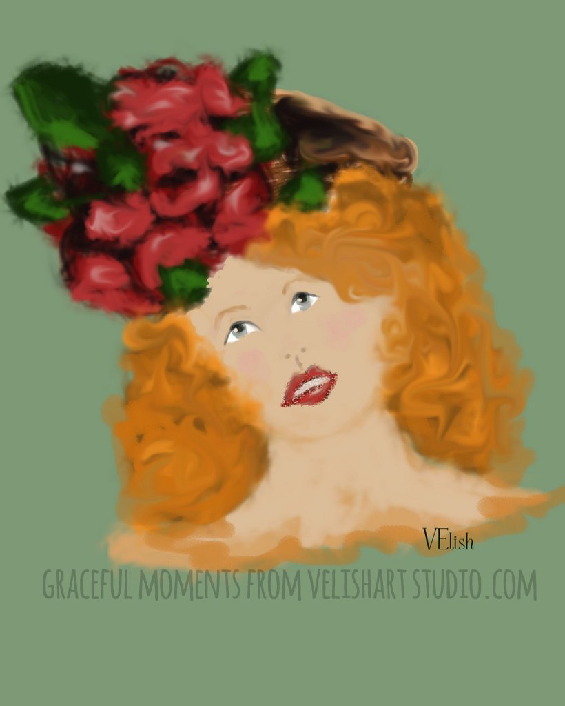 Do you ever just not want to get into the messiness of painting? It is a rare thing for me but one week I wanted to be creative but just did not want to make a mess. So, the computer and Photoshop were used to satisfy my creative urge. A “ginger” lady emerged from my screen. My grandmother had been on my mind a lot that day. She worked as a milliner in the early 1900s, before she was married. So, I thought it would be fun to add a big, crazy hat to this lady. This was done entirely in Photoshop. I also use Illustrator but prefer Photoshop for painting, probably because I have been using it for years and am a novice with Illustrator. Anyway, this was fun to do and no mess! It also sparked the idea for a series of “Hat Ladies” in acrylic sometime soon.