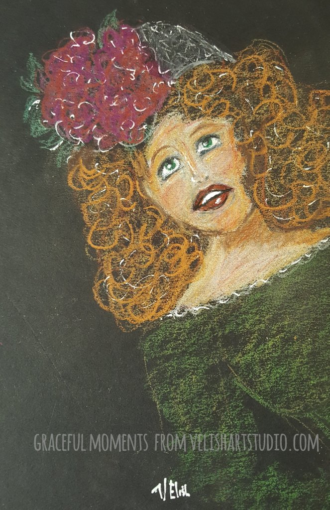 The next week my colored pencils were out for something else and found a piece of black mat board and decided to do a colored pencil version of the Lady with the Big Flowery Hat. This is how she turned out.